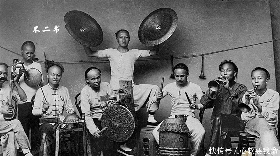 照片拍摄于清末时期,镜头下真实的乐队,靠着接红白喜事为生,画面中的乐师各自手持乐器。