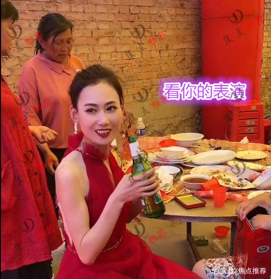 不过也有例外,有时候新娘比较豪爽,在喝酒的时候不但不拘束,在吃自己的喜酒的时候,也会体现豪爽的一面,这个漂亮的新娘,就在吃席的时候,拿起一瓶啤酒"对瓶吹"。