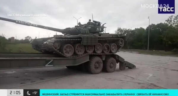 顿涅茨克武装部队坦克正在装上平板拖车,离开马里乌波尔 图片来源:"莫斯科24"电视台转载塔斯社视频截图