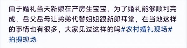 据了解,这场婚礼新娘并不在场,是由新娘的弟弟代替完成拜堂仪式的,而新娘本人则是在医院里生孩子。