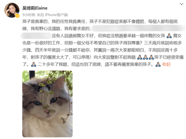 吴绮莉说这些年对孩子的伤害太大,这次发文也有向女儿道歉的感觉。