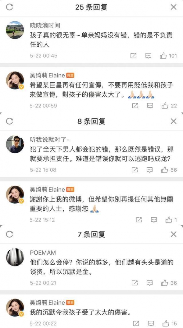 吴绮莉在留言区回复了多条评论,当有网友表示单亲妈妈没有错时,吴绮莉回复"希望某巨星再有任何宣传,不要再用贬低我和孩子来做宣传"。