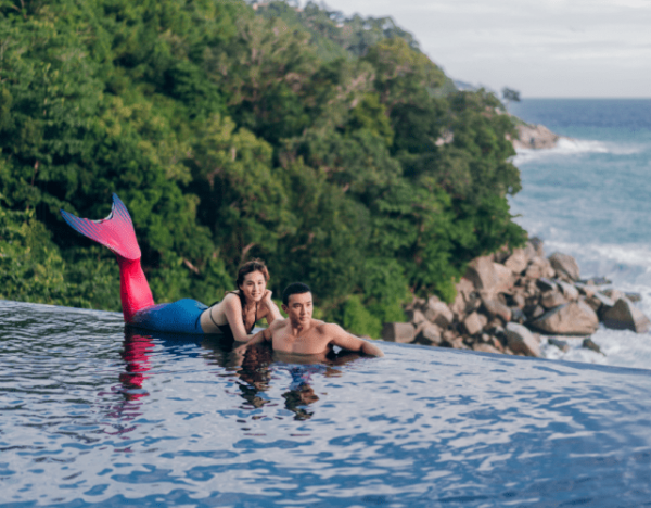 与此同时,刘畊宏还分享了一张与老婆游泳的合照,照片中,王婉霏身穿美人鱼泳衣变身人鱼公主,甜蜜趴在老公身边显得格外小鸟依人。刘畊宏则是赤膊出镜,一身健硕的肌肉简直不要太优越。