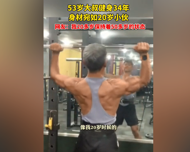 健身大叔说:"我今年五十三岁,19岁时一天出去突然就看到一个健身房,进去就喜欢上了。一练很快我就有改变,我目前就是健健康康的,保持一个像20岁的样子,健身已经融入我的生活"