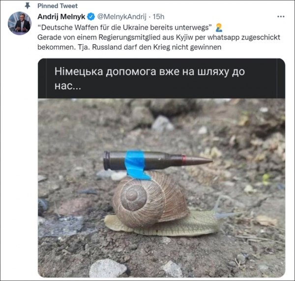 26日,乌克兰驻德国大使安德烈·梅利尼克(Andrij Melnyk)在推特上公布了这一消息,但却配上了一张蜗牛背上粘着一颗子弹的图片。而据其称,这张图是乌克兰官员发给他的。