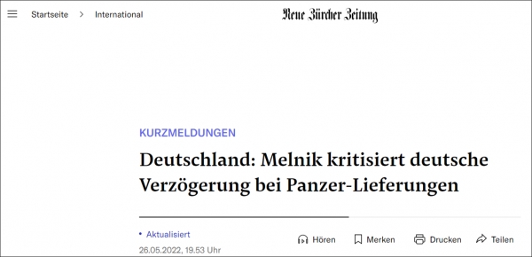 之后,梅利尼克又在25日公布的采访中指责德国政府拖延向乌克兰提供武器的审批程序。据塔斯社报道称,梅利尼克当时在采访中称,"令人失望的是,(德国)承诺的15门'猎豹'自行高炮最早要到7月底才能交付,另外15门要到8月底。"这位大使还暗批柏林犹豫不决,称"我们再次呼吁德国总理对落实这些至关重要的供给开绿灯"。