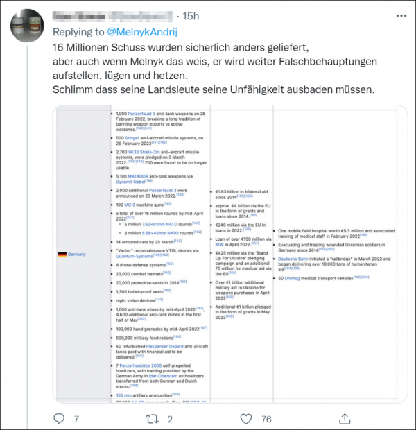 还有人贴出德国至今对乌克兰的援助列表,嘲讽梅利尼克称:"1600万发子弹肯定不是这样来的,但即使梅利尼克知道这一点,他也会继续发布虚假声明,撒谎和煽动情绪。可惜他的同胞要为他的无能买单。"
