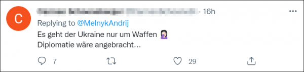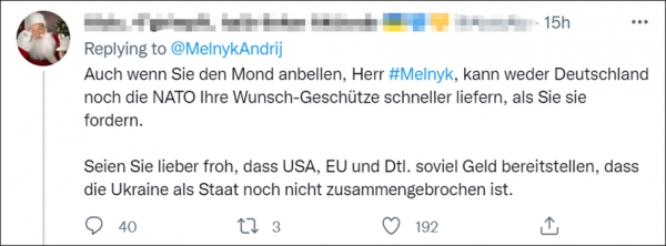 梅利尼克的这一推文激怒了德国网民,有人炮轰梅利尼克"撒谎和煽动情绪",还有人批评称"乌克兰只在乎武器",并直言乌克兰危机本可通过外交途径解决。