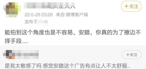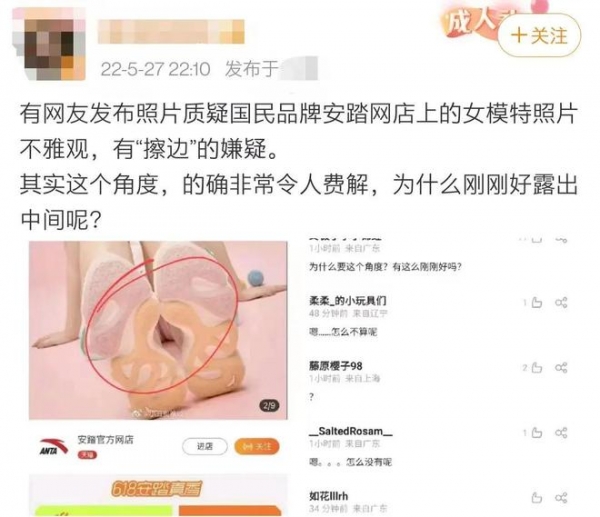 "明明有更好的展示鞋底的办法,非要这样,很难让人觉得不是擦边。" 一网友说道。记者浏览了安踏官方网店其他产品图,在拍摄鞋底的时候,多数是模特站立,抬脚或踮起脚尖来展示鞋底。有网友表示,"能拍到这个角度也是不容易,安踏,你真的为了擦边不择手段。"