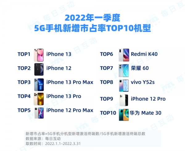 今年一季度卖得最好的10款5G手机中,苹果就占据了六个名额,iPhone 12和13系列除了mini外,其余六款机型全部上榜。安卓阵营仅Redmi K40、荣耀60、vivo Y52s和华为Mate 30,不仅数量差了2款,价格更是无法相对比。
