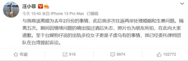 5月30日,汪小菲接连发文,就被传婚内出轨渣男以及与大S离婚原因等事件作出回应。称离婚前与张颖颖在酒吧亲密照为"因情绪问题的确出现过酒后失态",否认出轨多位女子,并表示她已经委托律师在台湾提起诉讼。