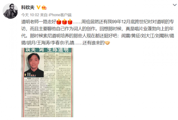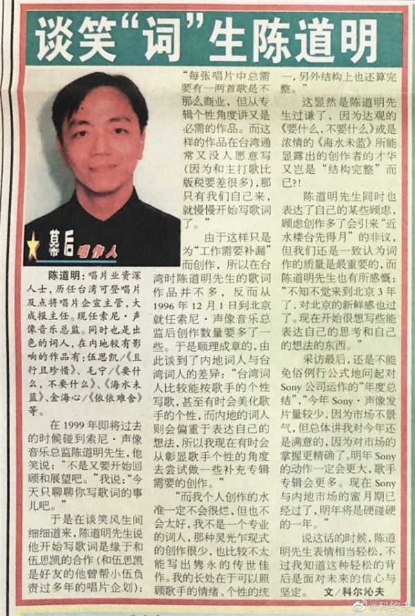 6月1日,据音乐人科钦夫透露,著名音乐人陈道明去世,科钦夫还晒出了99年对陈道明老师的专访:"道明老师一路走好周俭居然还有我99年12月底跨世纪时对道明的专访,而且主要聊他自己作为词人的创作。回想那时候,真是唱片业蓬勃向上的年代。"
