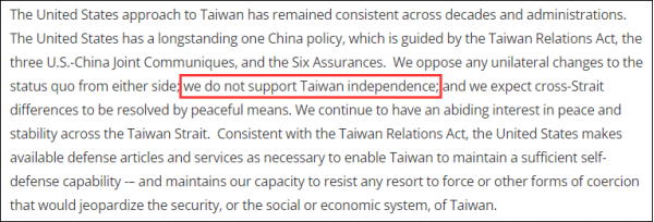 "美台关系事实清单"加回"美国不支持台独"表述 截图自美国国务院网站
