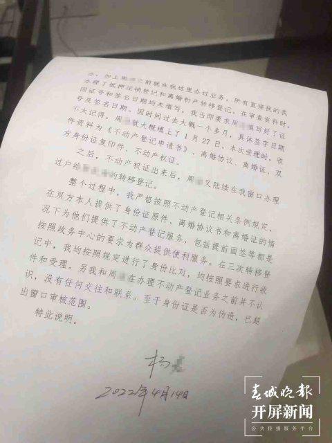 于是,他来到永州市政务中心不动产登记中心窗口询问。当时经办人杨某告诉他,办理时临近过年,周娟带过来的男人穿棉衣,戴口罩,"他说,他把口罩脱下来给我看了一下,马上又戴上去了,有点像,好像是你,又好像不是你,这是原话,我说这么重大的财产过户你不能用这么模棱两可的话来答复,他说那他给我前妻打个电话,核实一下"。