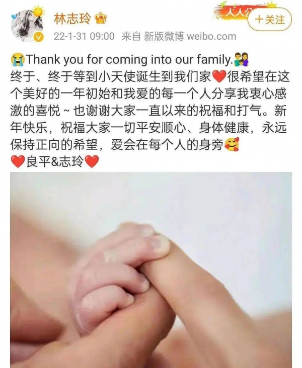 2022年1月31日,林志玲在社交平台官宣了生子的喜讯。