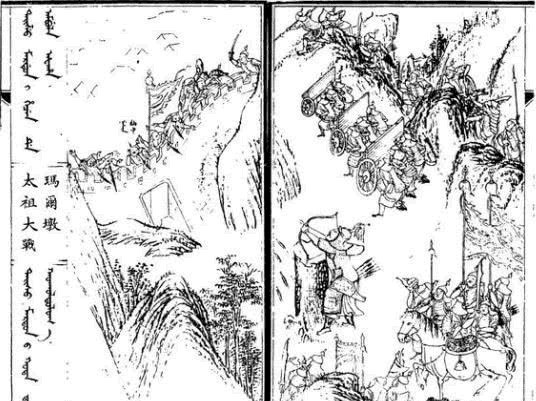 ▲《满洲实录》中描绘的《太祖大战玛尔墩》,可以清楚地看到步兵在楯车后发起进攻,弓手下马放箭