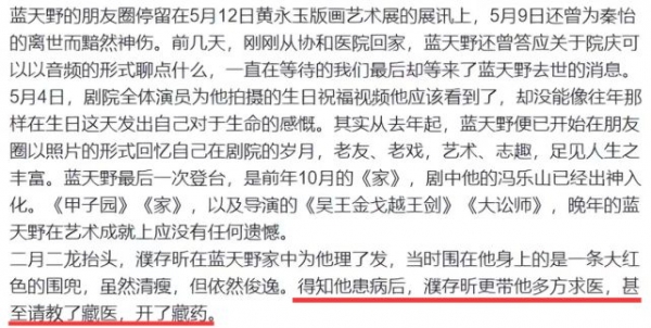 据蓝天野的生前同事透露,蓝天野在去年就已生病,蓝天野也透露自己患了胰腺癌,虽然病情不容乐观,但他积极治疗,濮存昕在今年2月份还带着他多方求医,甚至请教了藏医,开了藏药。