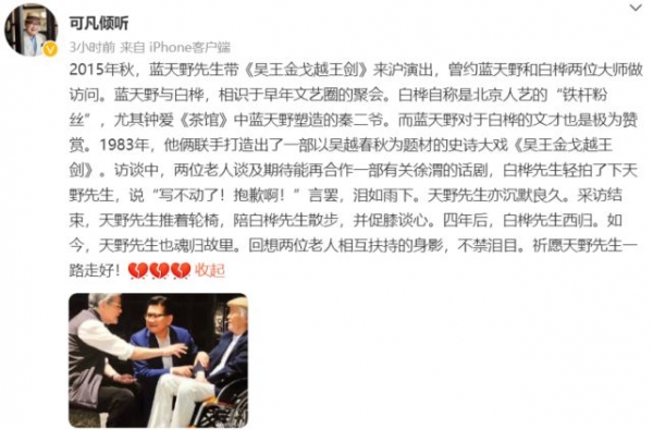 知名主持人曹可凡也特意发布动态回忆早年与蓝天野老师的美好回忆,当时的蓝天野老师较之以前消瘦不少,但整个人看上去依旧是温和亲切。