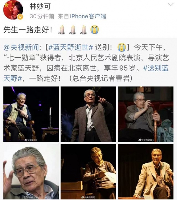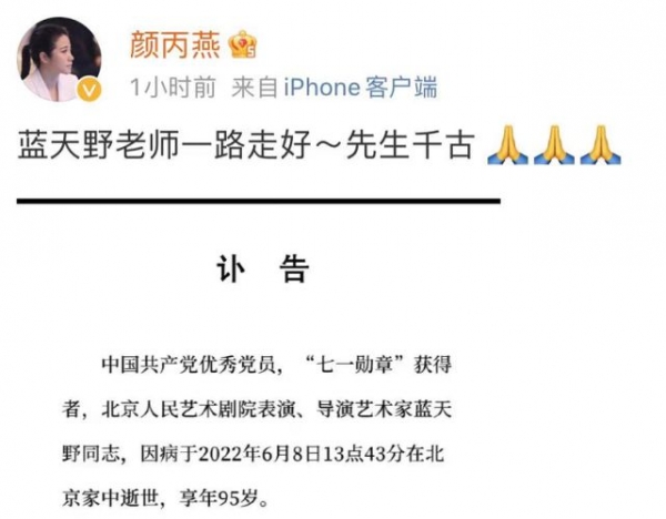 另外,演艺圈还有不少艺人先后发文悼念蓝天野老师,其中包括颜丙燕、傅艺伟、林妙可、傅迦等知名演员,其中不少与蓝天野老师生前有过合作,可以看出,蓝天野老师为人亲善,一直是大家心目中值得崇敬的前辈。