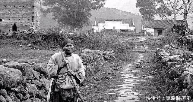 这张照片拍摄的是清朝末期农村的真实写照,图中是一条由石板铺成的小路。路边还站着一位农妇,她手拄着拐杖,旁边还停放着一个木桶,应该是刚做完农活的样子,腰上还有布缠绕着,里面还可以装东西。可见那时候的劳动人民还是十分聪明的。