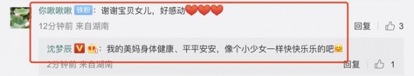 沈梦辰非常客气地回应:我的美妈身体健康,平平安安,像个少女一样快快乐乐的吧!