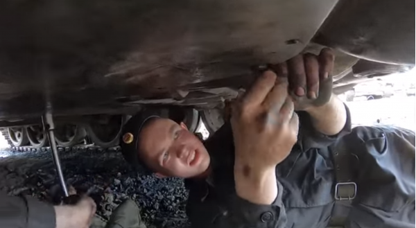 俄国防部10日公布俄军修理部队维护战车视频截图