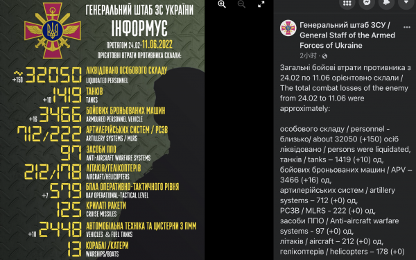 乌军总参11日公布的俄军损失列表,其中赫然包括32050名人员、212架飞机、13艘舰艇等数据