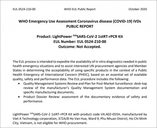 世卫组织2020年10月的一份报告明确指出,Viet A试剂盒并不符合世卫组织的采购资格。直到2022年4月世卫组织"不获EUL接受的产品"清单中,Viet A试剂盒仍榜上有名,理由是有关申请"未能满足安全性、性能和/或质量管理体系(QMS)所需的文件证明"。