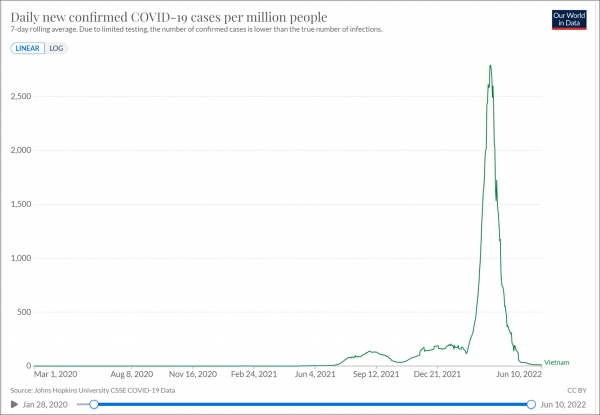 随着新冠变种病毒不断出现,越南这个"抗疫优等生"风光不再。经历了2021年下半年的疫情,越南的疫情曲线从2022年2月开始急剧上升,至3月中旬达到峰值,单日确诊人数一度突破20万例,随后开始下降。