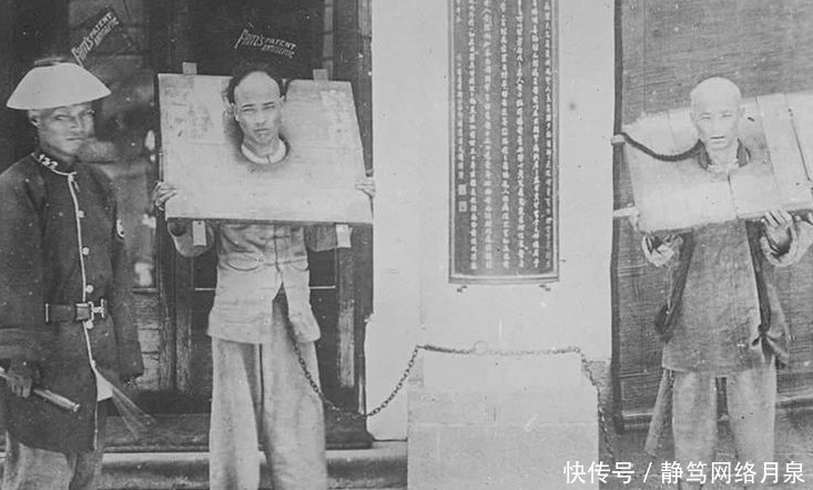 两位犯错的男子头戴枷锁,像狗被拴在墙上没有尊严,他们形体消瘦,眼神空洞,看不到希望。犯人戴枷锁在古代是一件非常平常的事情,就像我们现在的手铐一样,目的都是为了防止犯人中途逃跑,我们应该庆幸自己生在一个文明的社会,法律保障了我们的人权和生命财产权。