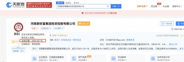 值得一提的是,今年2月,原银监会副主席蔡鄂生因受贿被逮捕后,吕奕曾协助调查,进去了几个月。天眼查显示,河南新财富集团已经于今年2月10日注销。