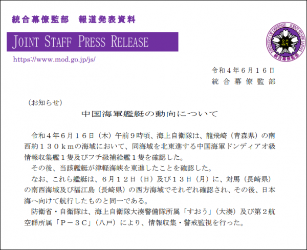 (观察者网讯)日本防卫省统合幕僚监部通报,6月16日上午9点(北京时间8时)左右,日本海上自卫队在青森县龙飞崎海岬西南方向约130公里的海域上发现向东北方向行进的中国海军794号侦察舰和902号补给舰(东平湖舰)。随后,两艘舰艇穿过津轻海峡继续向东前进。