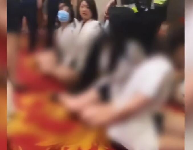 视频显示,酒店外有警车,酒店内多名男女坐在地上。