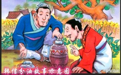 传说有一天,韩信骑着马在大路上行走,见路旁有许多人在围在一起看热闹。韩信走到近前一看,原来是两个中年汉子正为分油的事着急。