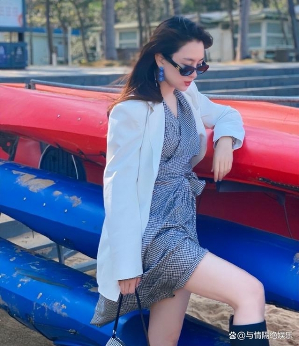 除此之外,马苏在日常中也会随意散步。照片中是马苏在一个公园里拍照,她打扮精致戴着墨镜,穿着紧身吊带裙,搭配长筒靴,非常有设计感。马苏靠在一旁,单脚踩在某处,当日的马苏穿搭时尚潮流。