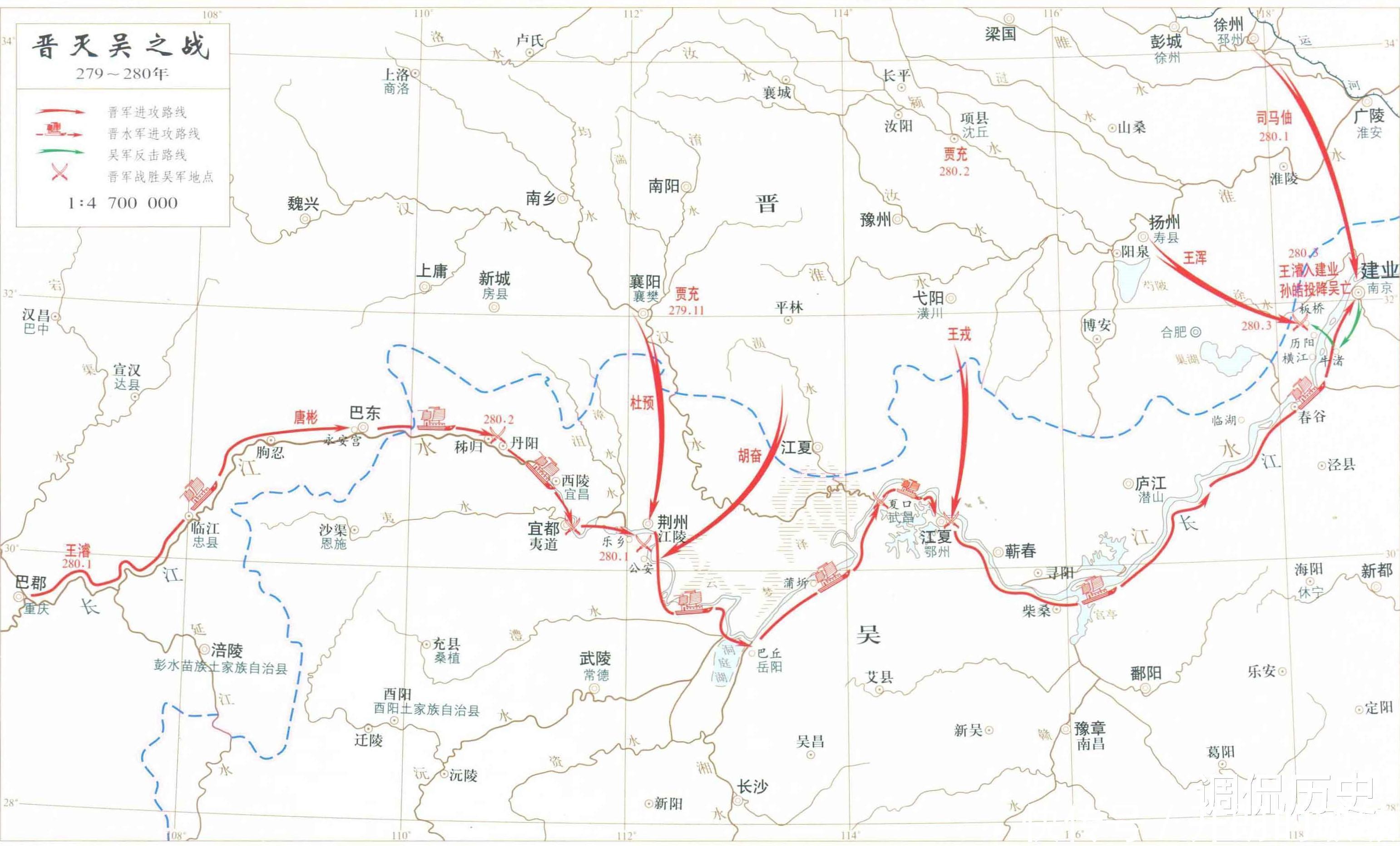 具体部署为:司马伷自下邳向涂中进军、王浑向江西方向进军、王戎自项城向武昌进军、胡奋自荆州向夏口进军、杜预自襄阳向江陵进军、王濬自巴蜀向西陵进军。