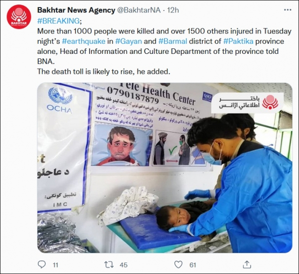 (观察者网讯)据阿富汗官方媒体巴赫塔尔通讯社22日报道,帕克蒂卡省信息和文化部门负责人透露,在此前地震中,仅帕克蒂卡省的加扬(Gayan)与巴尔马尔(Barmal)地区就有超过1000人死亡,超过1500人受伤。该官员补充说,死亡人数可能会上升。外交部表示,中方愿根据阿富汗方面的需求,提供紧急人道主义援助。