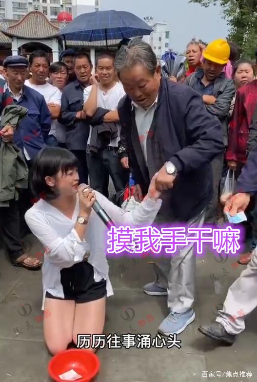 女网红在街头一边唱歌一边下跪装可怜,几名白发苍苍的大爷围观,献爱心打赏,女子主动抓住大爷的手握手,可在直播的时候却说"你摸我手干嘛",真的是太会装了,女网红正在直播,而线下的榜一大哥们正在打赏,还在一边演戏,这一幕被路人用第三视角记录下来,发到网上,引起网友热议