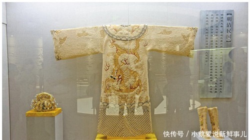 而龙下则是用精美的绣线织出了波涛翻涌的海浪,同时还用了杂宝祥云做点缀,其形状威武壮观。整件龙袍一共用了珍珠约十万粒,在当时来说可以说是奢侈到了极致,出来的效果也是光彩夺目,做工十分的精湛,让人移不开眼睛。