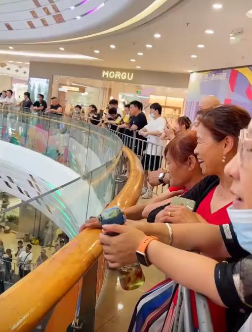 事情是这样的,在一个商场里,几位大妈趴在二楼护栏上,眼睛直勾勾地盯着楼下的表演,全程笑容满面。原本以为大妈们看的是小孩子们的演出表演,没想到确实健身选美大赛。