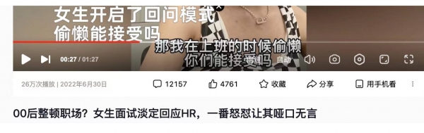 不止是聊天记录截图,6月29日,一段"00后面试狂怼HR"的视频同样斩获高热度。视频中,当HR询问是否可以接受加班,00后女孩直接反问:"那我在上班的时候偷懒,你可以接受吗?"