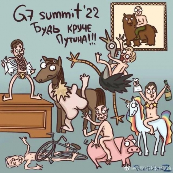 漫画里,最上头的英文,提醒这就是今年的G7峰会,墙上的照片,应该是光膀子正骑着马(草原神兽)的普京,下面,就是西方领导人心急火燎各种模仿普京的动作了。