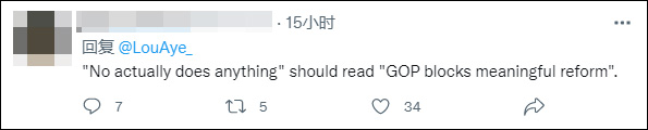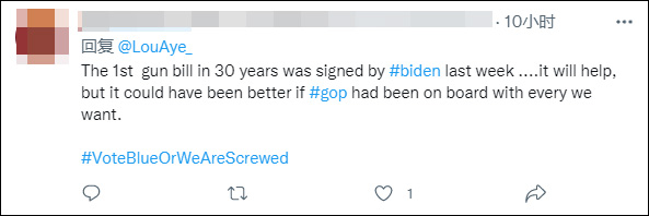 有网民则将问题的责任指向了共和党人,还有疑似是民主党支持者的网民指出,美国总统拜登上周签署了30年来的第一个枪支法案,如果共和党能提供支持,情况会更好。