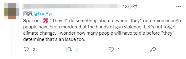 "完全正确。当'他们'(政客)认定有足够多的人死于枪支暴力之手时,'他们'就会'采取行动'。我们不要忘记气候变化。我想知道在'他们'认为这也是一个问题之前,还要死多少人。"