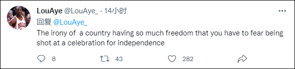 "LouAye"随后又在自己的推文下方补充写道:"讽刺的是,一个国家拥有如此多的'自由',以至于你不得不担心在独立日庆典上被枪杀。"