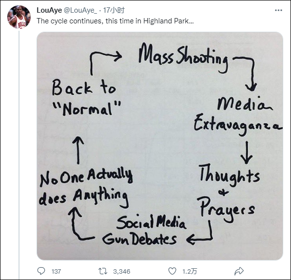 在社交媒体上,一张耐人寻味的图片道出了大实话--美国进入了一种"循环"。这一"循环"由一场枪击案开始,虽然看似有媒体报道、反思、枪支议题辩论等,但实则毫无用处,一切恢复如常后,等待美国的是又一场枪击案。