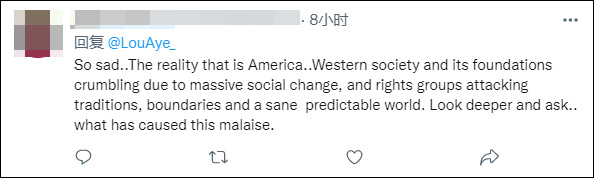 "太悲哀了,这就是美国的现实,西方社会及其基础由于大规模的社会变革而崩溃,'人权组织'攻击传统、边界和一个理智可预测的世界。看得更深一些不禁要问,是什么导致了这种不安定?"