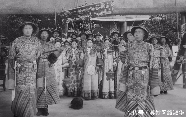图为1903年慈禧等人出行颐和园时的照片。最左边的太监是崔玉贵,最右是李莲英,地上的那一坨是慈禧爱犬'海獭'。