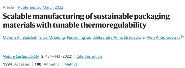 近日,相关论文以《具有可调热调节性的可持续包装材料的可扩展制造》(Scalable manufacturing of sustainable packaging materials with tunable thermoregulability)为题发表在 Nature Sustainability 上[1]。