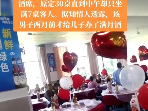 重庆一男子给儿子办百日酒,本来定好了30桌的酒席,结果到了中午开席的时候,也只坐满了7桌,而来宾还都满脸怨气。